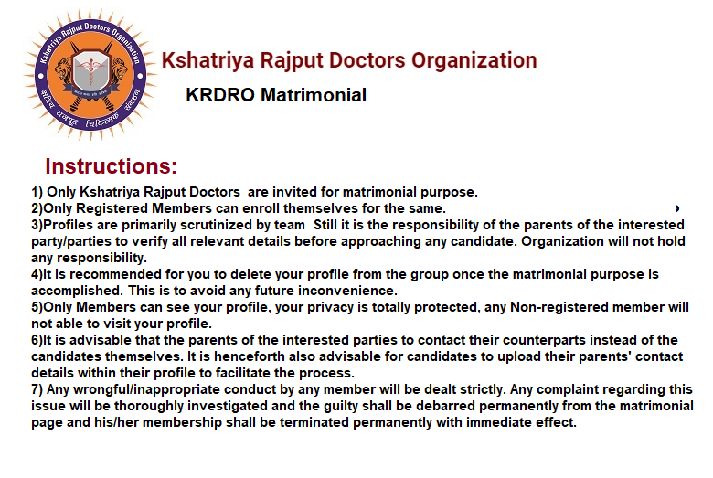 In addition to being a Doctor one must belong to true Hindu Kshatriya Rajput Community, must not have indulged in an inter caste marriage. Both the parents of these aspiring members should be pure line Hindu Kshatriya Rajput's as well.